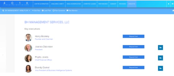 After you bring in a new retirement plan to prospect, you can create a compelling, quantitative break-down of the plan’s investments all in neatly prepared report. The next step in this process is of course to get this report in the hands of someone who can read it. With the Larkspur Executive, all you need to do is press the tab that says “Executive”, and you will be tapped into our new database. This report lists off all of the Key Executives for the plan as well as their contact info and social media links. With this info you can network directly with the people you need to talk to. Even more you can request email addresses for any of these executives and we will include it for you. On top of this, you can even sync your own LinkedIn account to uncover any direct or 2nd connections that you have already at the company, whether they are a Key Executive or not. Additionally, we include any email addresses, phone numbers, or other social media profiles for the company that are available. See an example below: