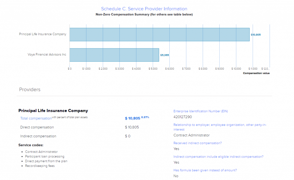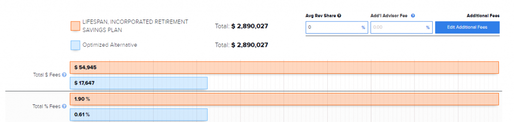 We can see here in figure 2, this plan is paying $10,805 (0.37%) to Principal life Insurance Company. In the 401kFiduciaryOptimizer we can take these fees and combine them with savings from fund expense to get a clear look at all the fees.